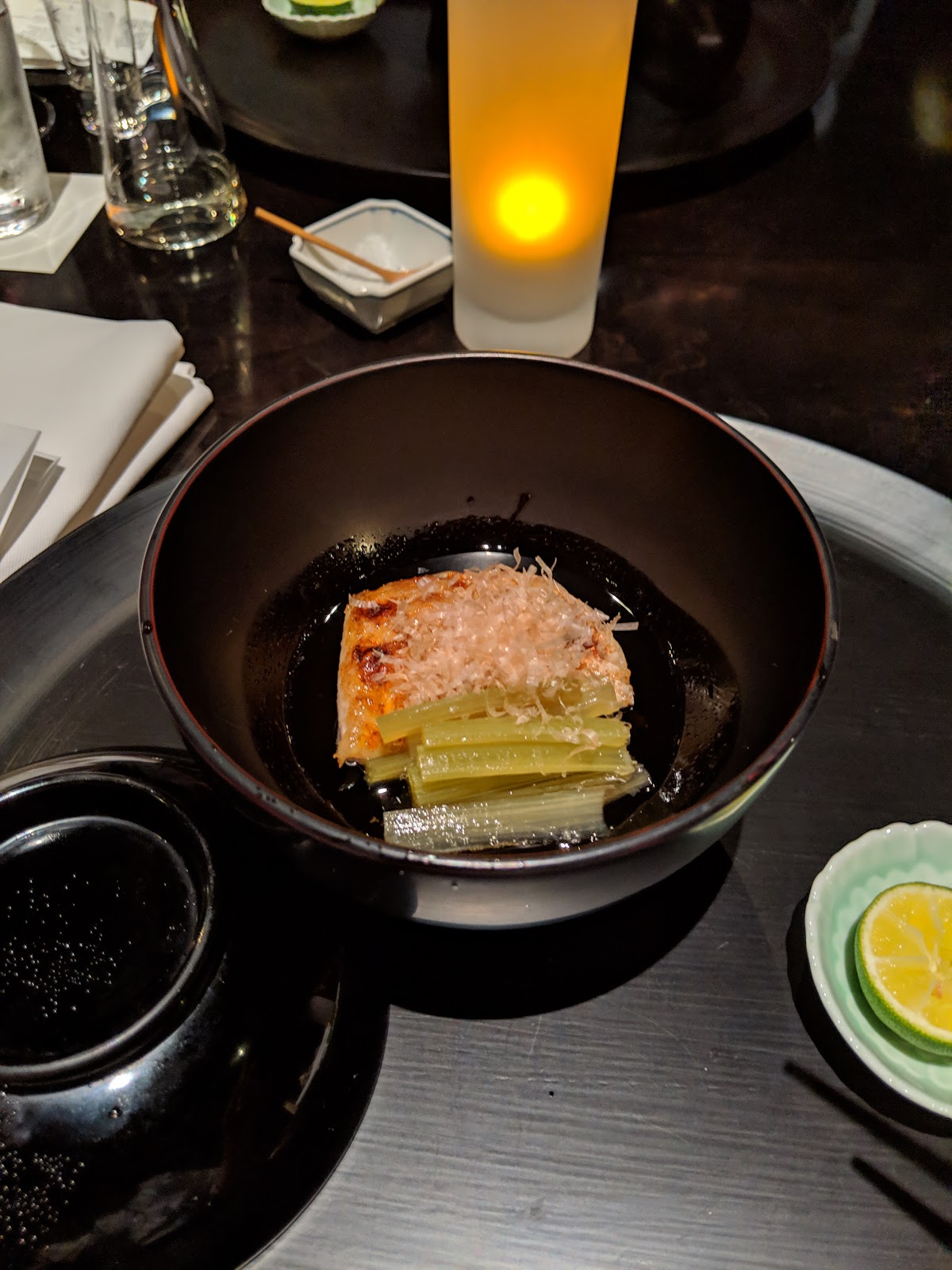 For dinner that night, Lauren wanted to try out an Izakaya that received rave reviews on Tripadvisor called Kazusan-tei. She called and was able to get us two seats at 6:30PM by speaking Japanese to the owner Kazu-san. We arrived just before 6:30 and were seated at the bar, where the owner's son greeted us and took our drink orders. The menu was completely in Japanese, but between Lauren and Google Translate, we managed to interpret enough to order some Basil Fried Chicken, Skirt Steak, Taco Spring Rolls (a speciality of Kazu-san's), and pork belly with bitter melon tempura. All the food was delicious, though the basil fried chicken was truly amazing, and one of the best things we've eaten in Japan. We each had about 4 drinks (all drinks in Japan are relatively diluted), and stuffed ourselves, having a wonderful time. At one point, the owner's son came up and asked us our names, which we provided. He returned a little while later with artistic hand paintings of our names, and an artistic painting of a Shiso dog, which he gave to us as gifts to take home.
